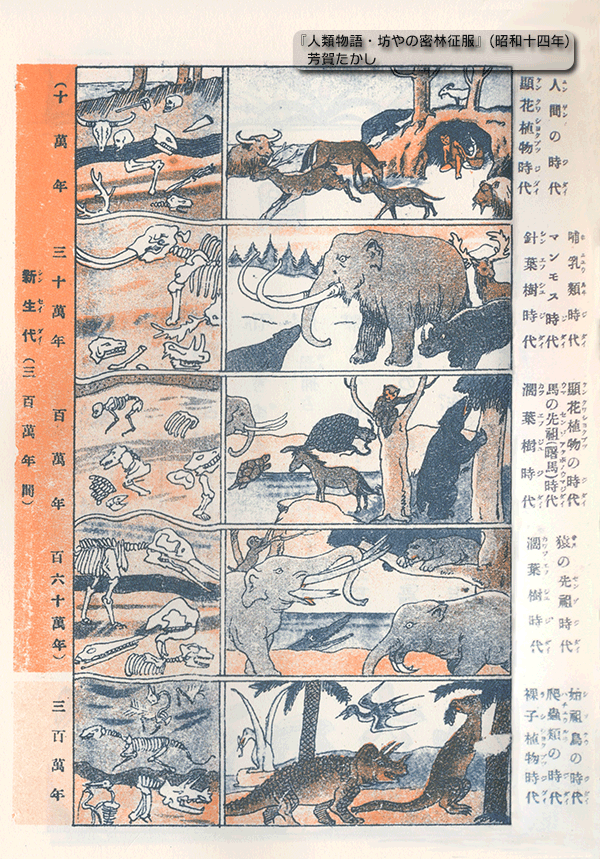 『太郎の旅・月世界探検』はこの当時のデータで作成されているためか、 現在とは違う記述もしばしば出てきます。 例えば『人類物語・坊やの密林征服(芳賀たかし・昭和14年)』には 恐竜時代が600〜300万年前と書かれていますが、 現在では2億5000〜6550万年前が定説となってます。